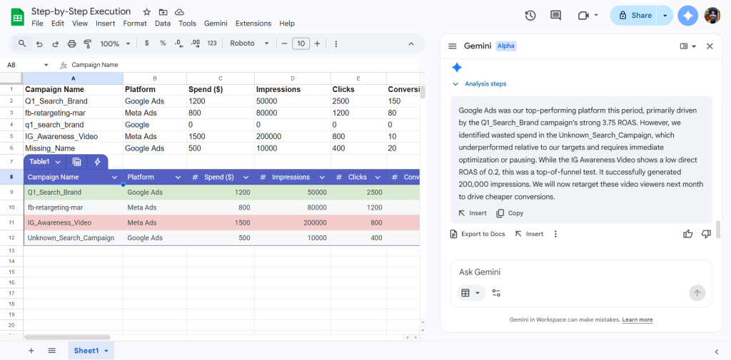 - Write a strict cleansing immediate: Sort the next command: “You’re a information analyst. Evaluation this desk. Repair inconsistent platform names so all of them say both ‘Google Advertisements’ or ‘Meta Advertisements’. Merge the duplicate ‘q1_search_brand’ row into ‘Q1_Search_Brand’. Identify the ‘Missing_Name’ marketing campaign ‘Unknown_Search_Campaign’. Output the cleaned desk.”