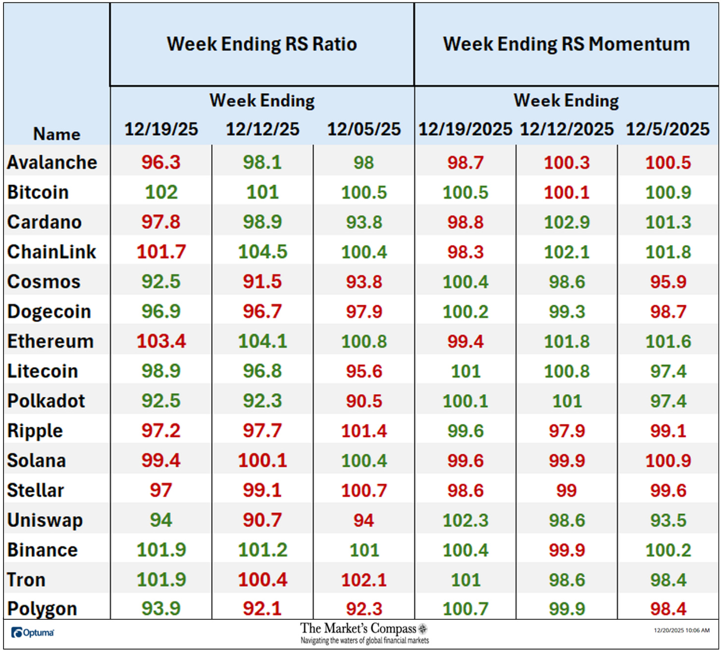 I’ve additional “tweaked” the added new characteristic the “Tabulation Desk” that now marks the Relative Power and Relative Power Momentum readings vs. the CCi30 Index on the finish of final week and I’ve now added the 2 previous week once we final revealed the Crypto Candy Sixteen Research on 12/12. If there was an enchancment in both the Relative Power Ratio or the Relative Power Momentum studying because the previous week, I’ve highlighted it in inexperienced. If there was a contraction in each it’s highlighted in crimson and an unchanged studying in both will stay black. The colour-coding system has served as a warmth map over the previous three weeks highlighting both the continued enchancment, deterioration, or stasis vs. the benchmark CCi30 Index.