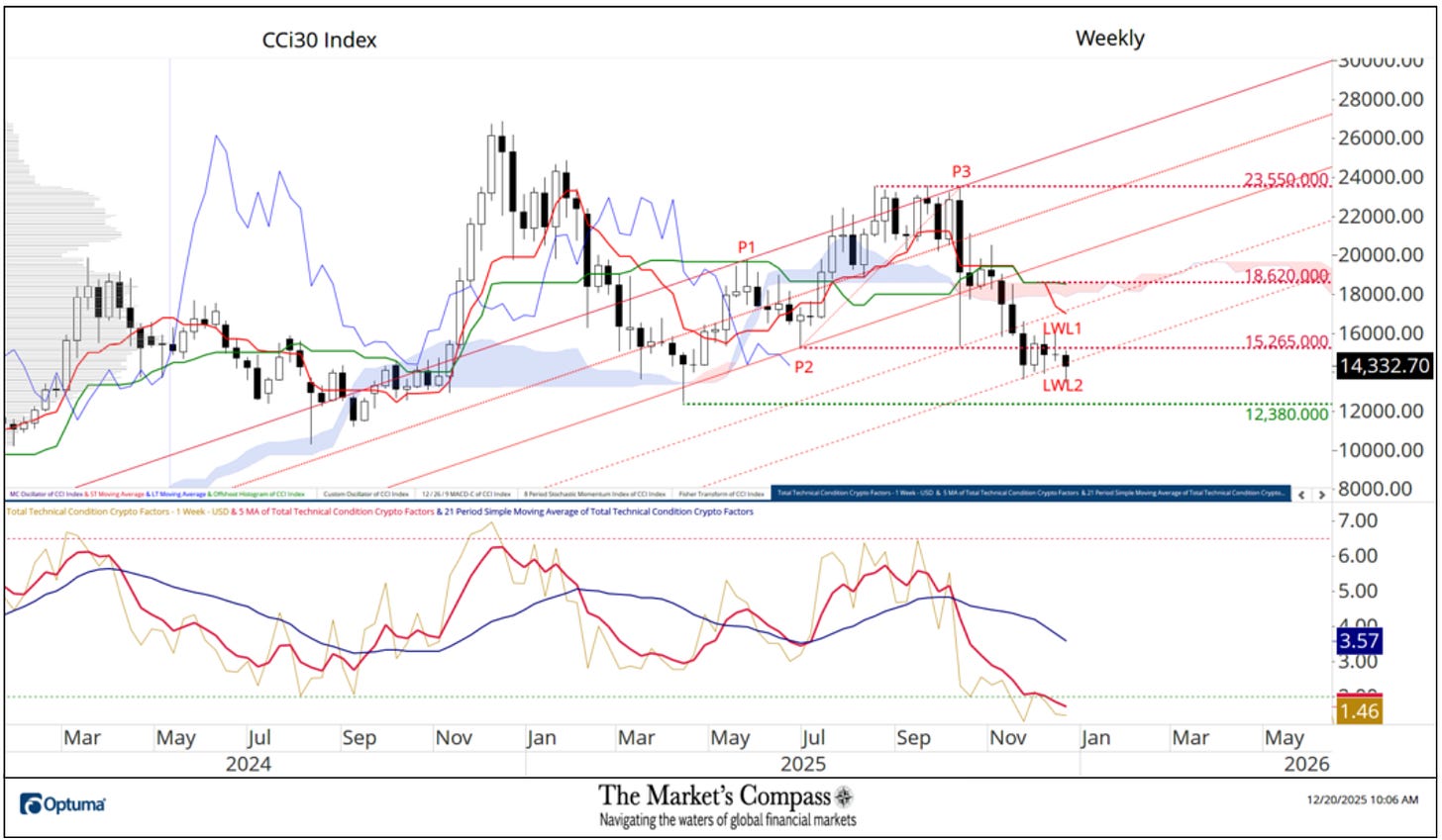 The CCi30 Index has churned sideways for 5 weeks, however final week the Index closed just under potential assist on the second Decrease Warning (crimson LWL2). Though it was a minor violation on the finish of final week, it nonetheless doesn’t give solace to the beleaguered bulls and means that key assist will almost definitely be examined on the intra-week April eleventh lows at 12,380. With it, the Complete Technical Situation Crypto Issue Oscillator stays mired in oversold territory beneath its shorter-term 5-Week Transferring Common (crimson line).