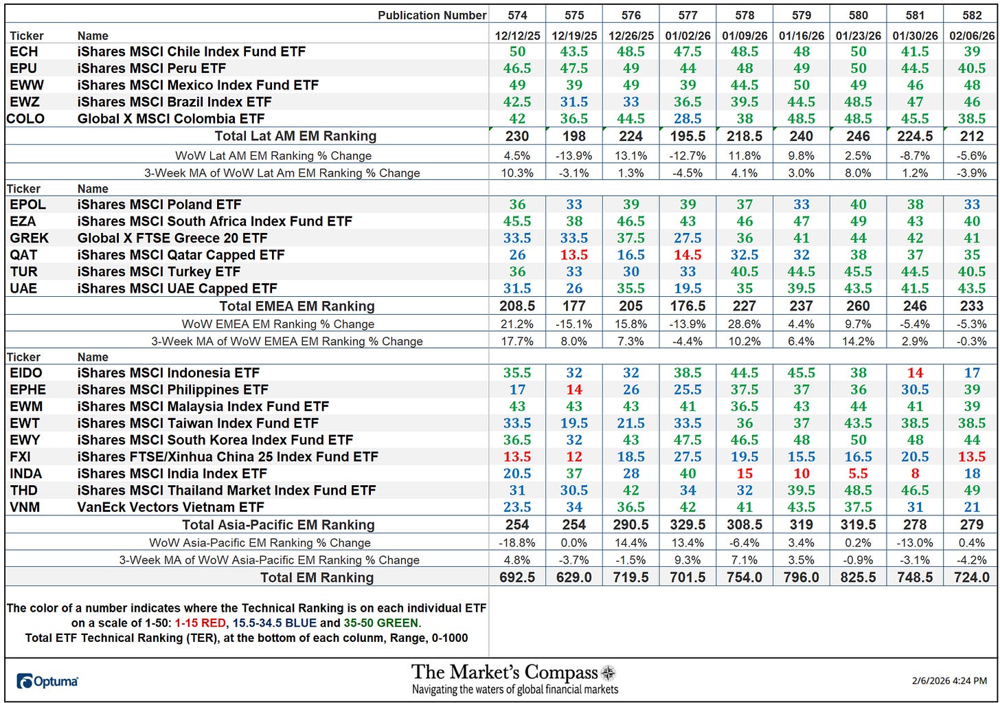 *The technical rating system is a quantitative method that makes use of a number of technical concerns that embrace however aren’t restricted to pattern, momentum, measurements of accumulation/distribution and relative energy of every particular person 20 EM Nation ETFs that may vary between 0 and 50. The Whole EM Technical Rating or “TEMTR” is the sum of the twenty particular person TRs and could be considered as an overbought / oversold indicator in addition to a affirmation / non-confirmation indicator. There may be additionally a Whole Rating for every geographic area that may be considered as a relative measurement on every week over week foundation.
