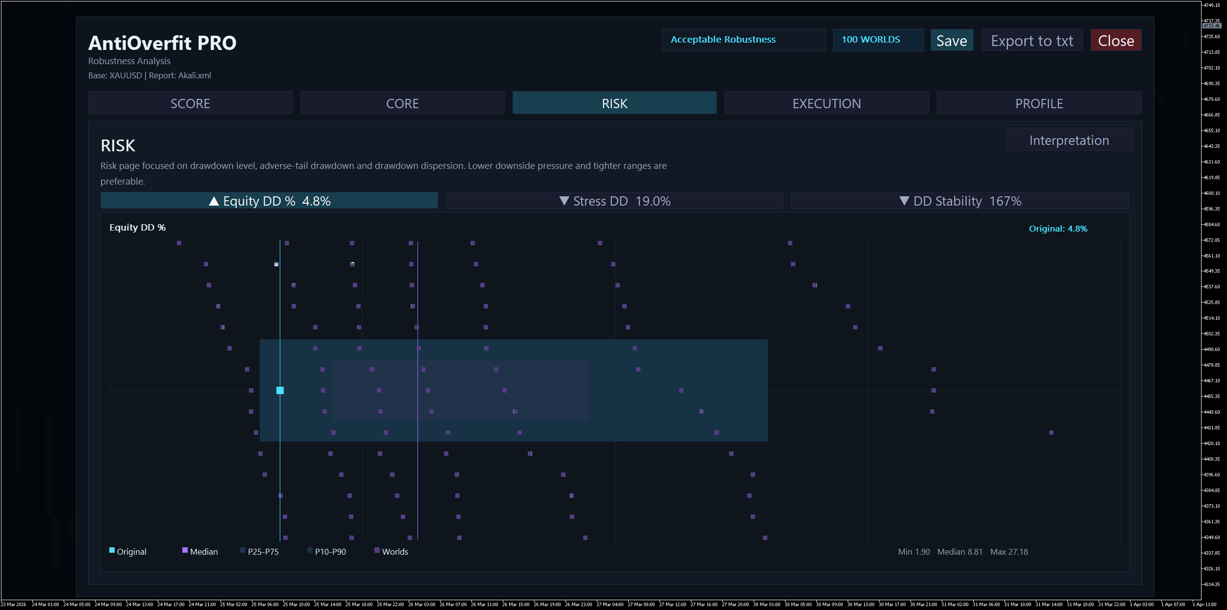 On this evaluation, the EA Akali was evaluated on the XAUUSD image, utilizing 100 artificial worlds , all of which have been thought of legitimate for the ultimate outcome.