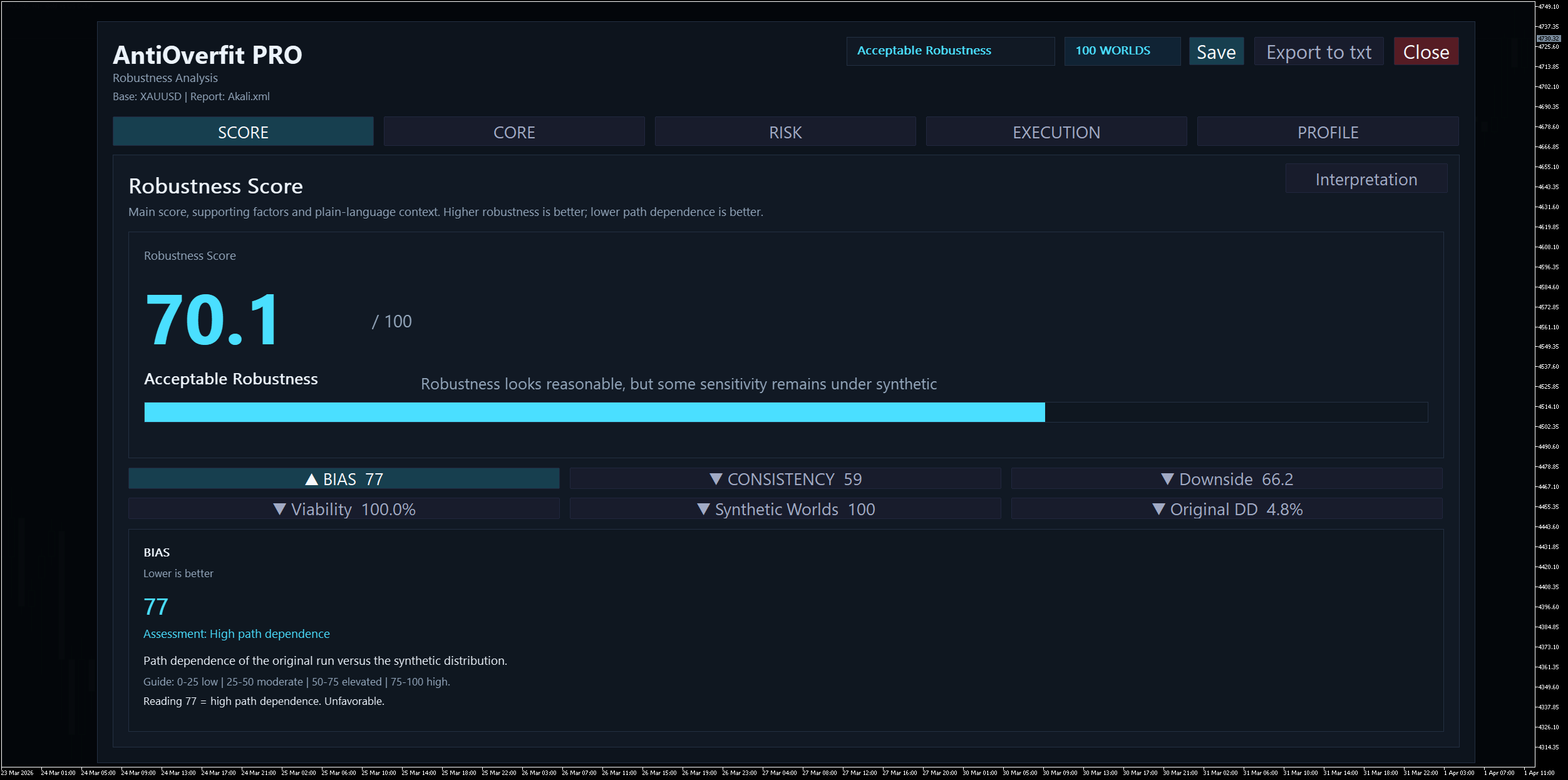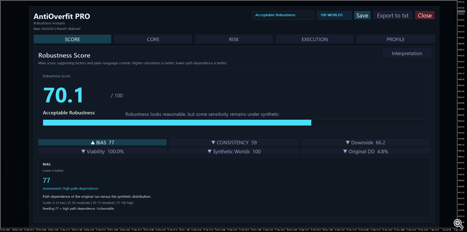 The Bias block scores 77/100 and is labeled as excessive path dependence . This means that the unique historic knowledge is comparatively favorable in comparison with the artificial situations . It would not invalidate the backtest, but it surely does point out that a few of the efficiency will depend on the precise path of the previous market . - The execution is extra steady than the outcome.