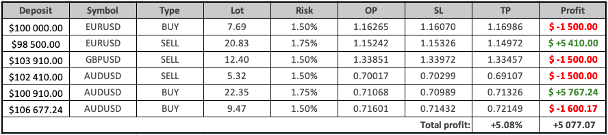 In line with the weekly outcomes, 4 trades had been closed at StopLoss and a couple of trades reached TakeProfit. The ultimate monetary end result amounted to +$5 077.07, confirming the soundness of the technique when buying and selling guidelines are persistently adopted. The detailed information for every place is supplied within the closing desk.