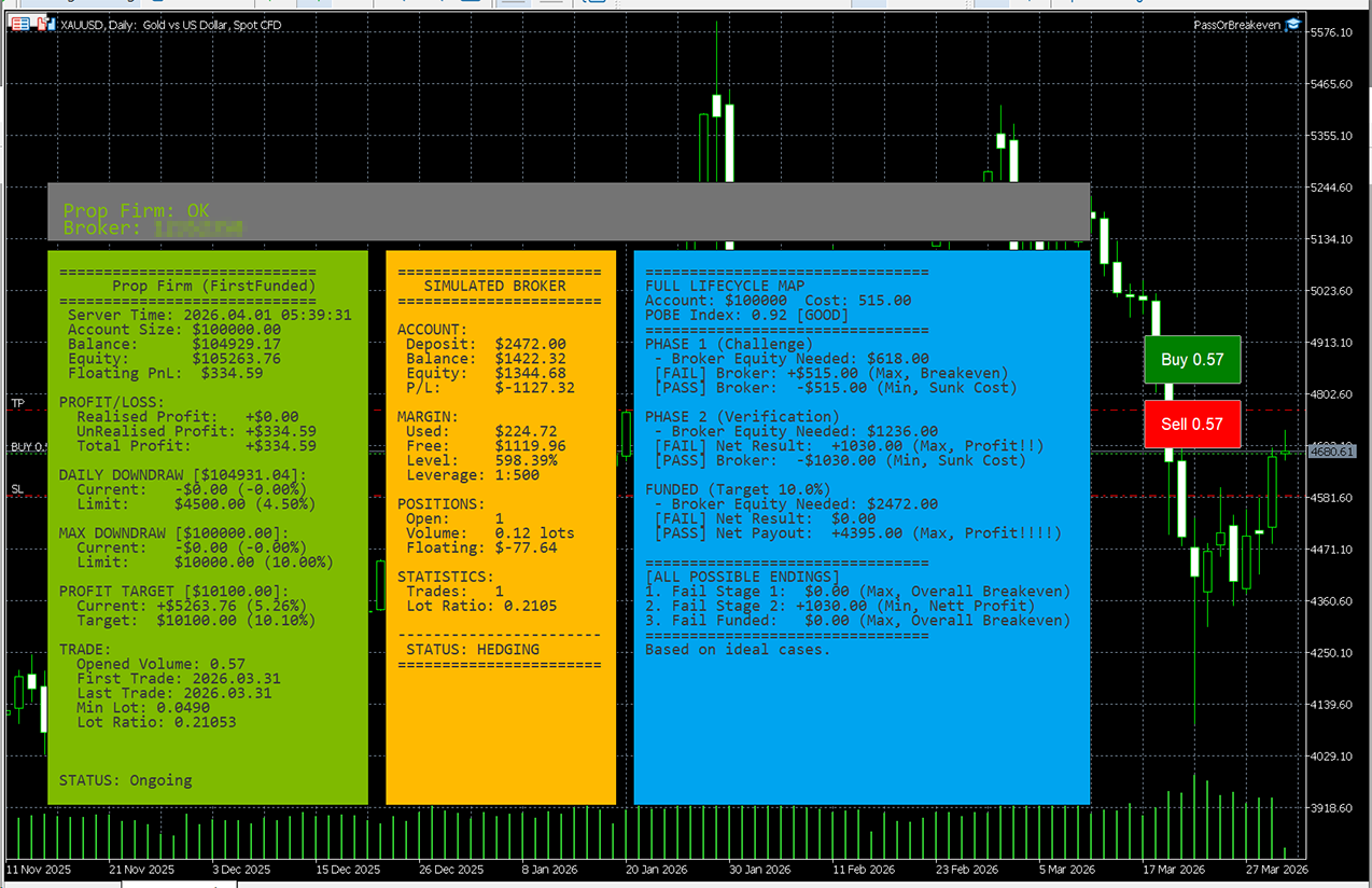 Many merchants assume POBE’s job is finished as soon as Section 1 and Section 2 are handed and a funded account is obtained. This can be a frequent false impression. Passing Section 1 and Section 2 means the dealer account has been carrying opposing positions all through each analysis phases and has collected a sunk value. The funded section is the place that sunk value is recovered — both by way of a funded revenue that offsets it totally, or by way of a funded breakeven that closes the lifecycle at no web loss. Operating the funded section by way of POBE is just not non-compulsory — it’s the remaining leg that completes the hedge. With out it, the dealer sunk value from each analysis phases stays unrecovered.