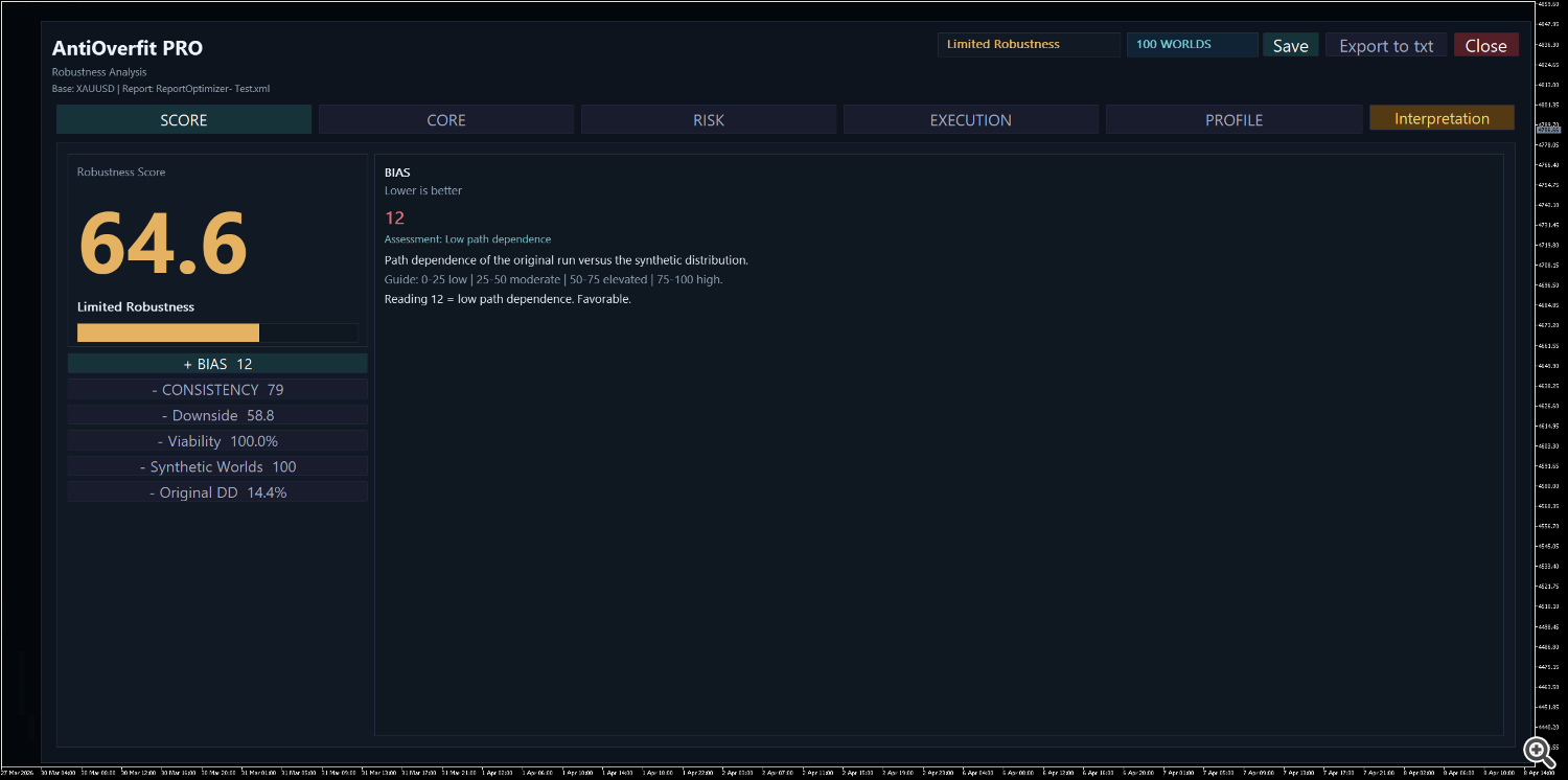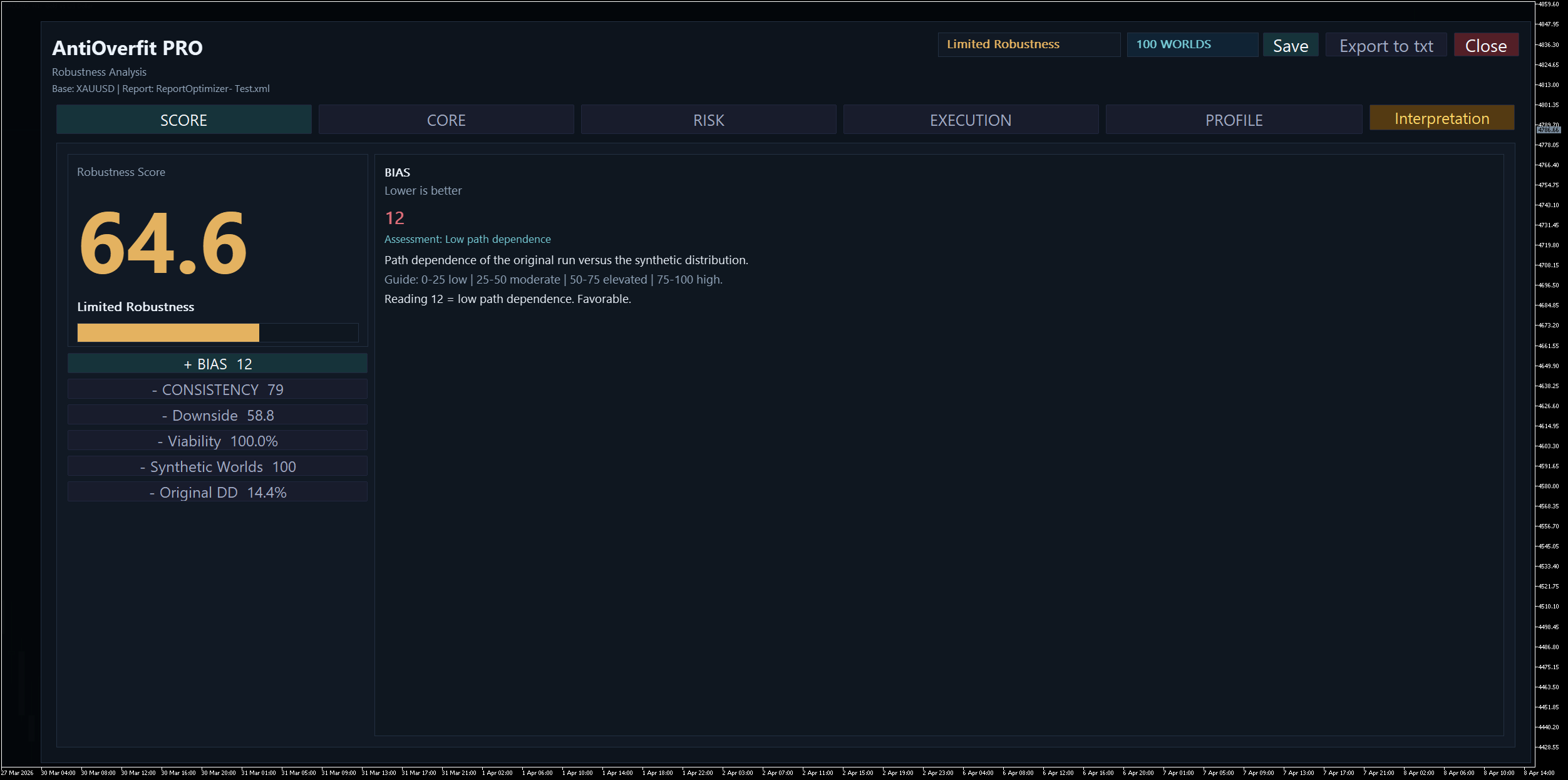 On this instance, AntiOverfit PRO returns a rating of 64.6 out of 100 and a label of Restricted Robustness.