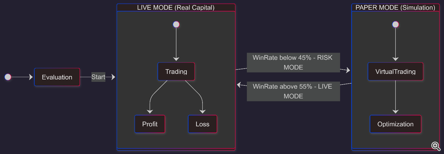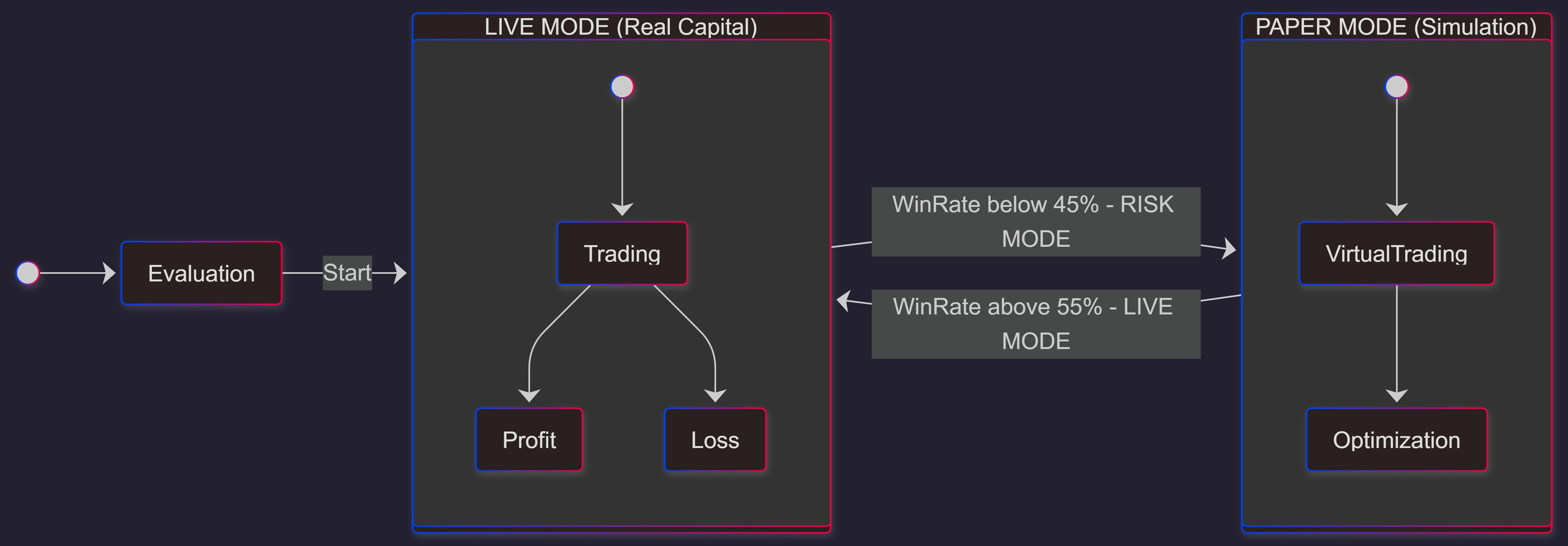 • Paper Mode (Kill Swap): If the Win Price drops beneath 45%, the system robotically disconnects from the dwell order move. It continues to commerce in an inner simulation (Paper Mode) till statistical confidence is restored.