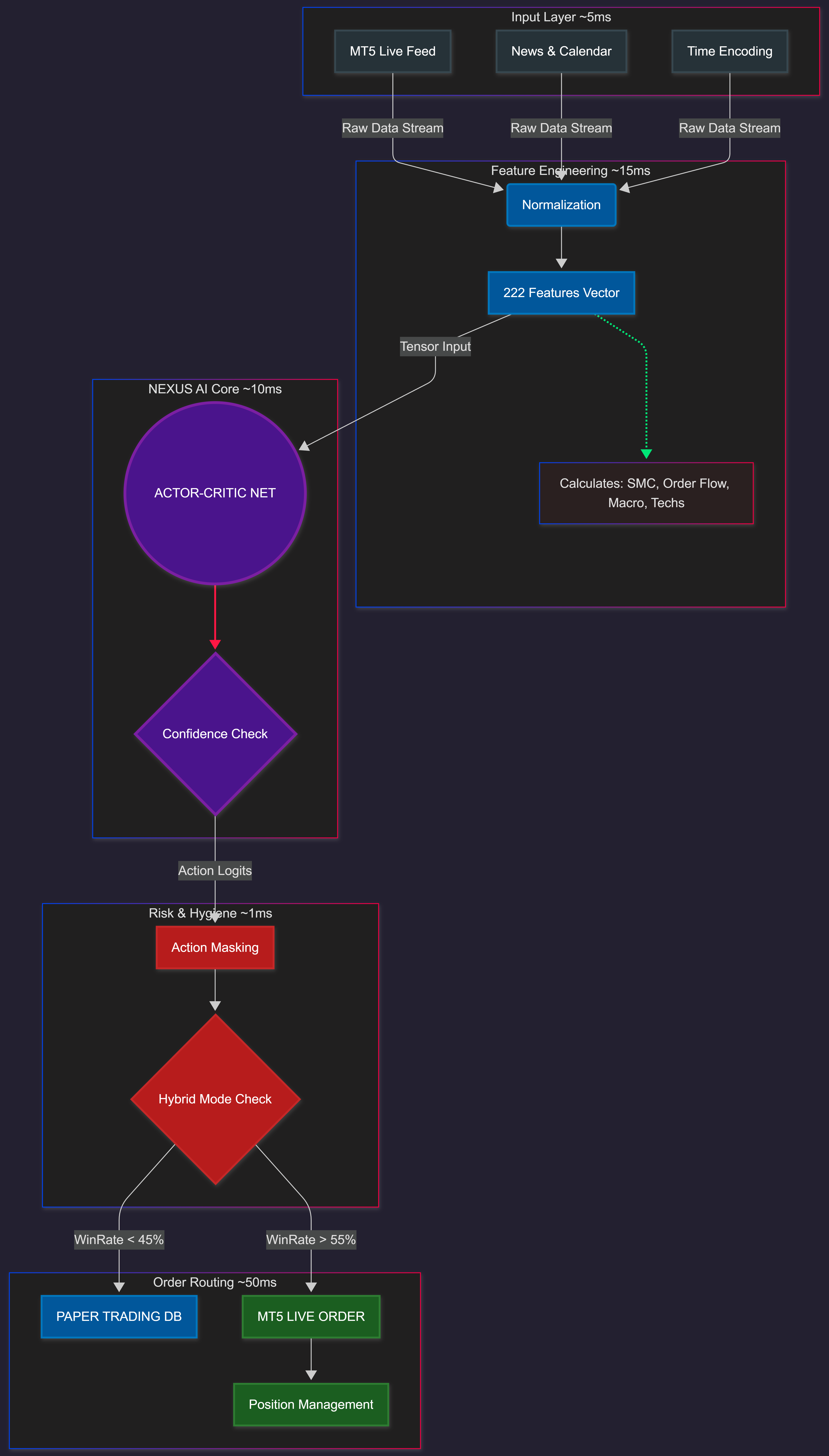 Not like conventional Professional Advisors that depend on inflexible if/else logic or easy indicator crossovers (RSI/MACD), NEXUS is constructed upon a Deep Reinforcement Studying (DRL) framework, particularly using Proximal Coverage Optimization (PPO).