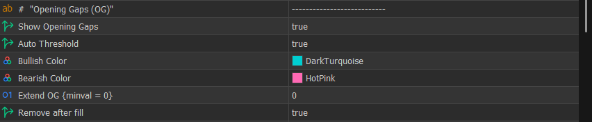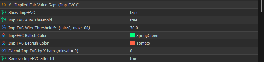 FVG Auto Threshold – Filters weaker gaps routinely, the place enabling it produces cleaner charts and disabling it permits detection of all imbalances together with minor ones.