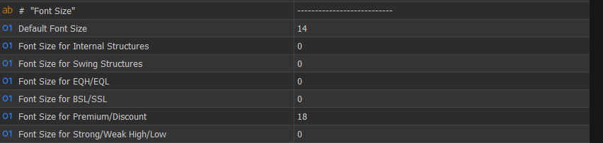 1) Normal · 2) Pattern · 3) Inside Construction · 4) Swing Construction · 5) Inside Order Blocks · 6) Swing Order Blocks · 7) Equal Excessive / Low · 8) Purchase/Promote Aspect Liquidity · 9) Honest Worth Gaps · 10) Inverse FVG · 11) Implied FVG · 12) Balanced Worth Vary · 13) Liquidity Voids · 14) Opening Gaps · 15) Premium / Low cost · 16) Multi-Timeframe · 17) Greater Timeframe OHLC · 18) Periods · 19) Font Measurement · 20) Alerts