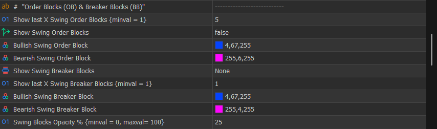 Bearish Swing Order Block – Defines the colour used for bearish swing order blocks.