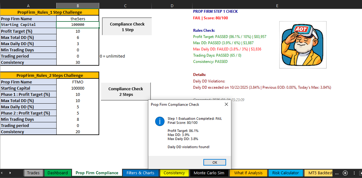 One other nice replace on v1.8 that we added to our Excel ProTrading analytics template :Â Prop Agency Compliance checker